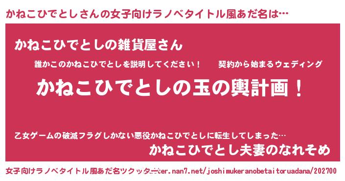 | 男性向けラノベタイトル風あだ名 | 『転生したらかねこひでとしだった件』 |