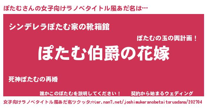 | 男性向けラノベタイトル風あだ名 | 『やはりぽたむの青春ラブコメはまちがっている 』 |