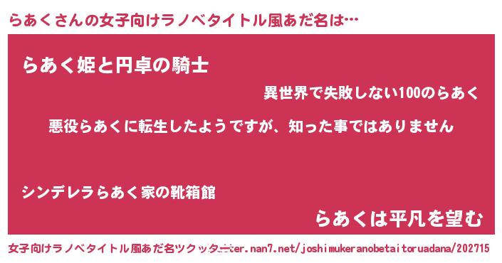 | 胡散臭い通販商品みたいなあだ名 | 『あなたにだけ特別に提供する限定10本のレアな日本酒…その名も「らあく」』 |