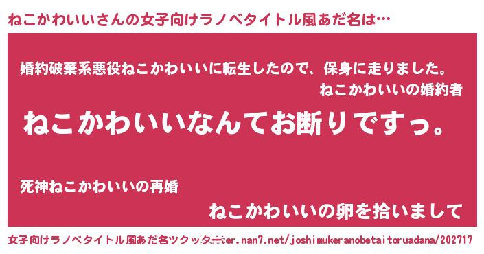 | 男性向けラノベタイトル風あだ名 | 『魔法科高校のねこかわいい』 |