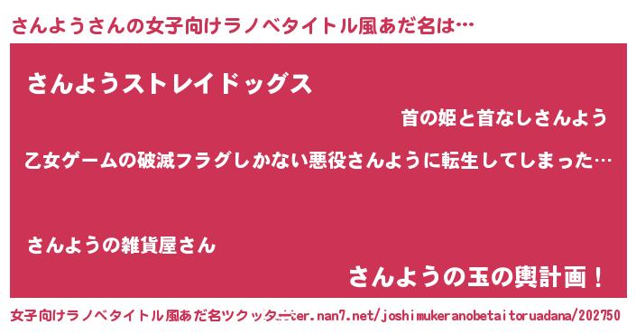 | 男性向けラノベタイトル風あだ名 | 『魔弾の王とさんよう』 |