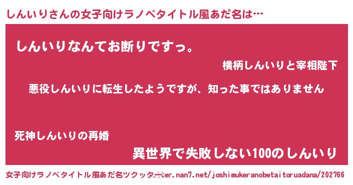 | 男性向けラノベタイトル風あだ名 | 『この素晴らしい世界にしんいりを!』 |