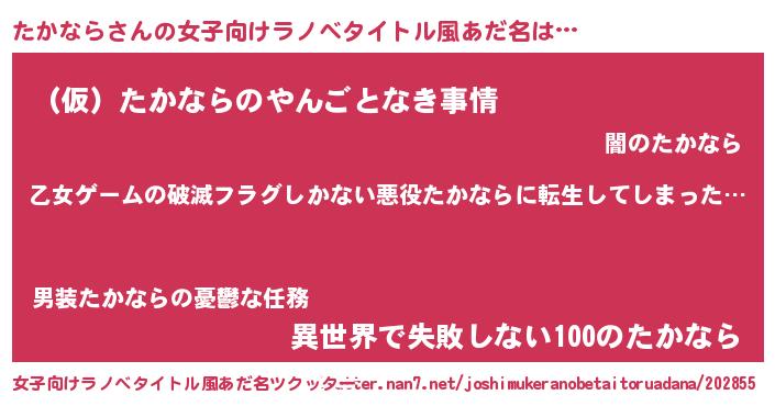 | 男性向けラノベタイトル風あだ名 | 『この素晴らしい世界にたかならを!』 |