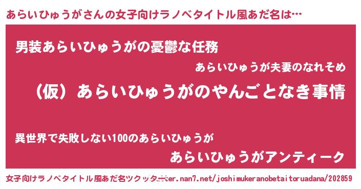 | 男性向けラノベタイトル風あだ名 | 『あらいひゅうがの憂鬱』 |