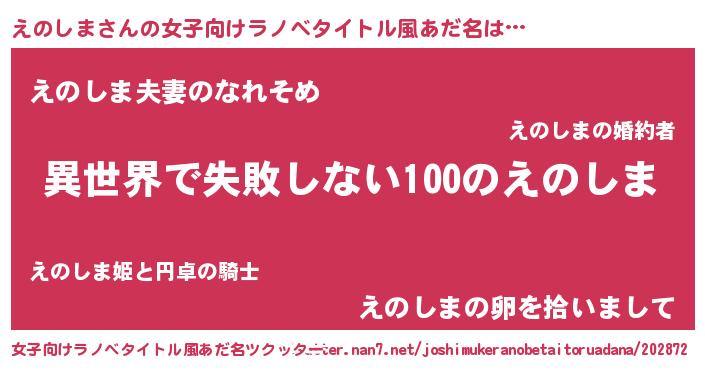 えのしまさんの女子向けラノベタイトル風あだ名は… 『異世界で失敗しない100のえのしま』『えのしま夫妻のなれそめ』『えのしまの卵を拾いまして』 ツクッター #女子向けラノベタイトル風あだ名ツクッター http://tkutter.nan7.net/joshimukeranobetaitoruadana/202872/