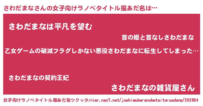 | 男性向けラノベタイトル風あだ名 | 『魔弾の王とさわだまな』 |