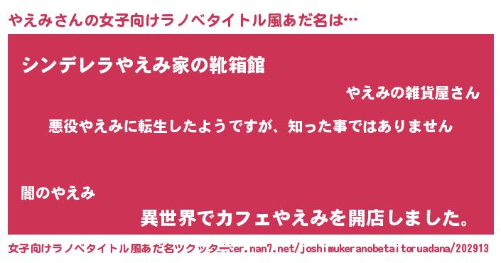| 男性向けラノベタイトル風あだ名 | 『この素晴らしい世界にやえみを!』 |