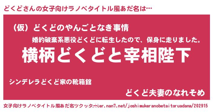| 男性向けラノベタイトル風あだ名 | 『どくどに滅ぼされるだけの簡単なお仕事です』 |
