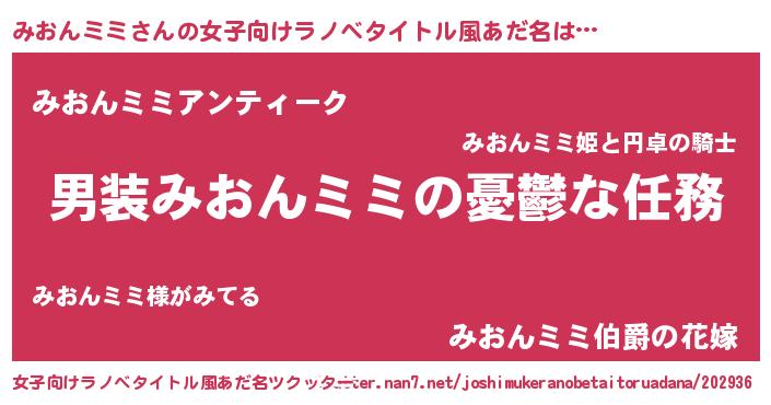 | 男性向けラノベタイトル風あだ名 | 『冴えないみおんミミの育てかた』 |
