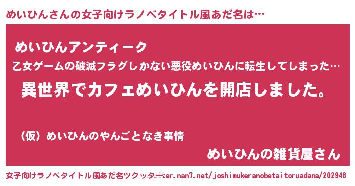 | 男性向けラノベタイトル風あだ名 | 『誰もが恐れるあのめいひんが、ぼくの専属メイドになるようです。』 |