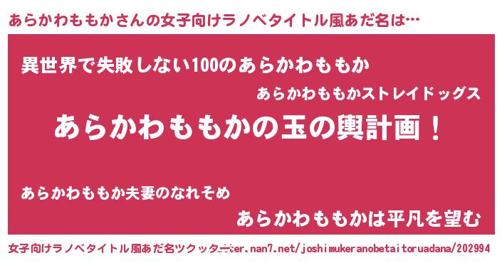 | 男性向けラノベタイトル風あだ名 | 『あらかわももか~年齢イコール彼女いない歴の魔法使い~』 |