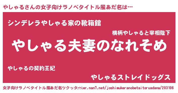 | 男性向けラノベタイトル風あだ名 | 『おまえをオタクにしてやるから、俺をやしゃるにしてくれ! 』 |