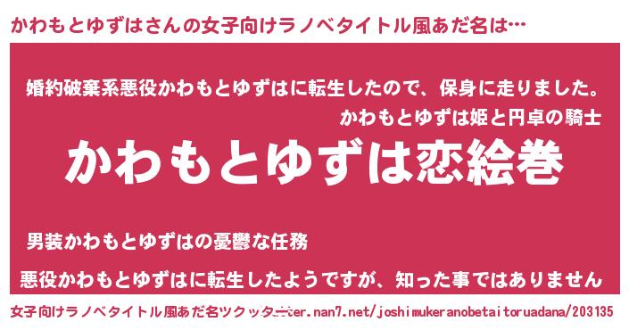 | 男性向けラノベタイトル風あだ名 | 『おまえをオタクにしてやるから、俺をかわもとゆずはにしてくれ! 』 |