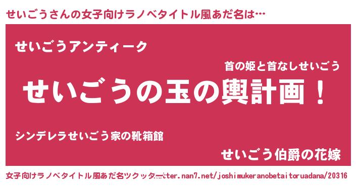 せいごうさんの女子向けラノベタイトル風あだ名は… 『せいごうの玉の輿計画!』『せいごうアンティーク』『せいごう伯爵の花嫁』 ツクッター #女子向けラノベタイトル風あだ名ツクッター http://tkutter.nan7.net/joshimukeranobetaitoruadana/20316/