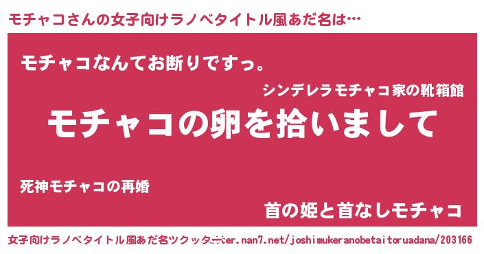 | 男性向けラノベタイトル風あだ名 | 『モチャコの嫁は女の子じゃないと思った?』 |