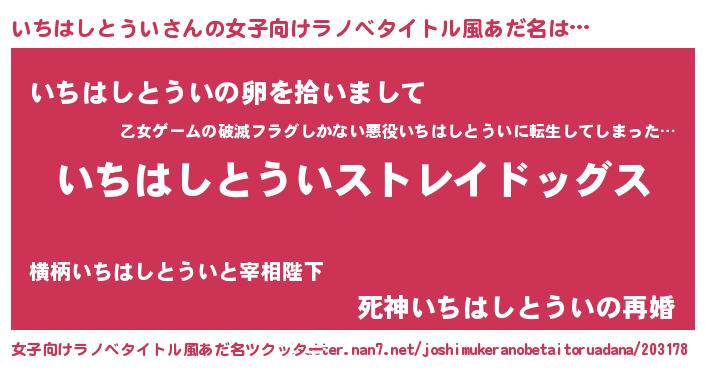 | 男性向けラノベタイトル風あだ名 | 『Re:いちはしとういから始める異世界生活』 |