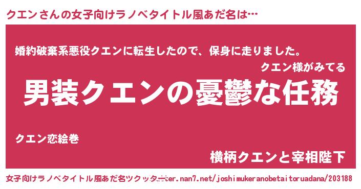 | 男性向けラノベタイトル風あだ名 | 『うちのクエンが世界を掌握している!』 |
