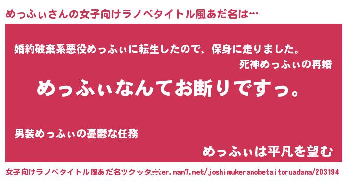 | 男性向けラノベタイトル風あだ名 | 『魔法科高校のめっふぃ』 |