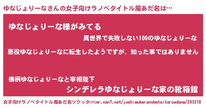 | 男性向けラノベタイトル風あだ名 | 『この素晴らしい世界にゆなじょりーなを!』 |