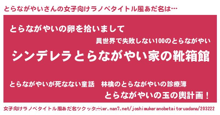 | 胡散臭い通販商品みたいなあだ名 | 『信頼と実績のネックレス…その名も「とらながやい」』 |