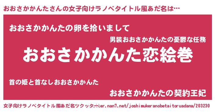 | 男性向けラノベタイトル風あだ名 | 『おまえをオタクにしてやるから、俺をおおさかかんたにしてくれ! 』 |