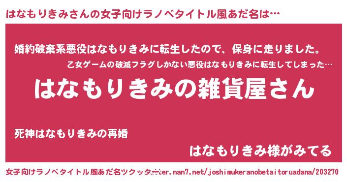 | 男性向けラノベタイトル風あだ名 | 『やはりはなもりきみの青春ラブコメはまちがっている 』 |