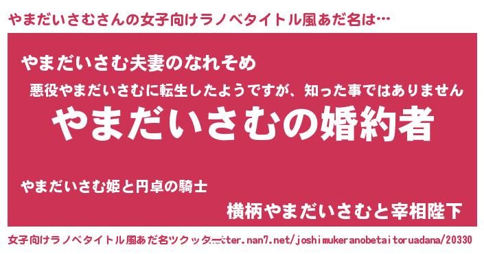 | 男性向けラノベタイトル風あだ名 | 『うちの娘の為ならば、俺はもしかしたらやまだいさむも倒せるかもしれない。』 |