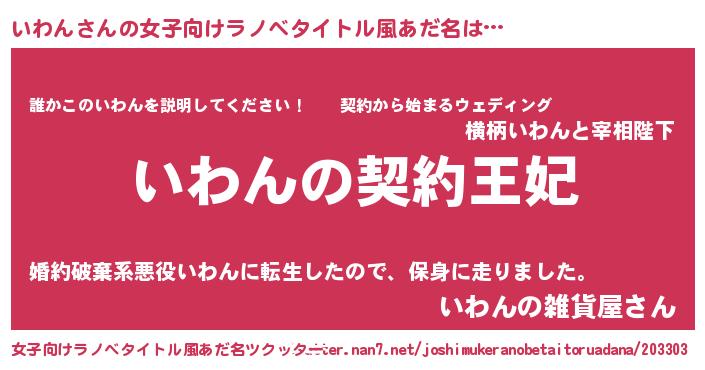 | 男性向けラノベタイトル風あだ名 | 『誰もが恐れるあのいわんが、ぼくの専属メイドになるようです。』 |