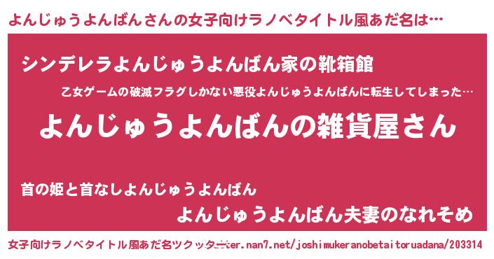 | 男性向けラノベタイトル風あだ名 | 『やはりよんじゅうよんばんの青春ラブコメはまちがっている 』 |
