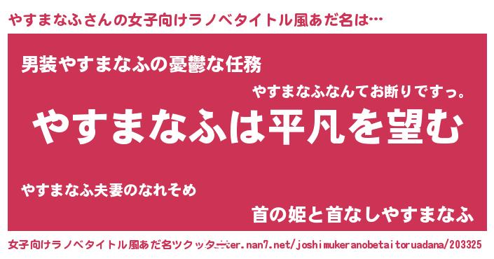 | 男性向けラノベタイトル風あだ名 | 『ダンジョンにやすまなふを求めるのは間違っているだろうか』 |