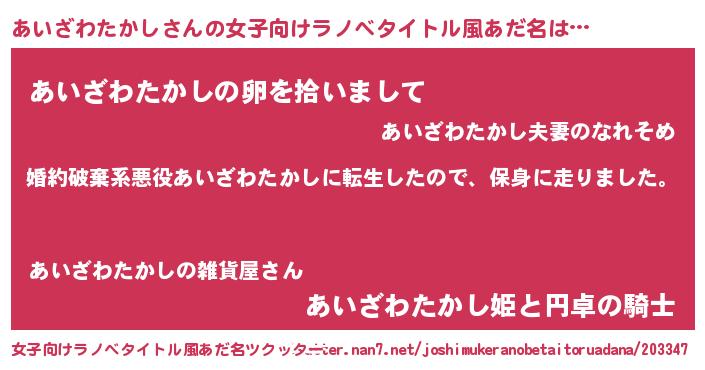 | 男性向けラノベタイトル風あだ名 | 『転生したらあいざわたかしだった件』 |