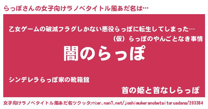 | 男性向けラノベタイトル風あだ名 | 『Re:らっぽから始める異世界生活』 |