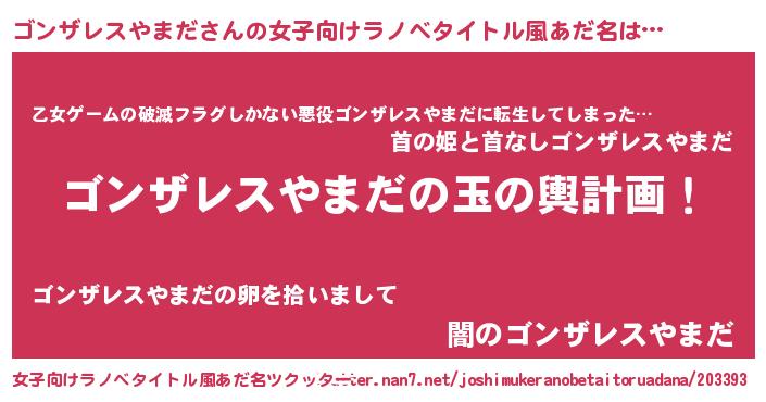 | 男性向けラノベタイトル風あだ名 | 『ゴンザレスやまだ~年齢イコール彼女いない歴の魔法使い~』 |