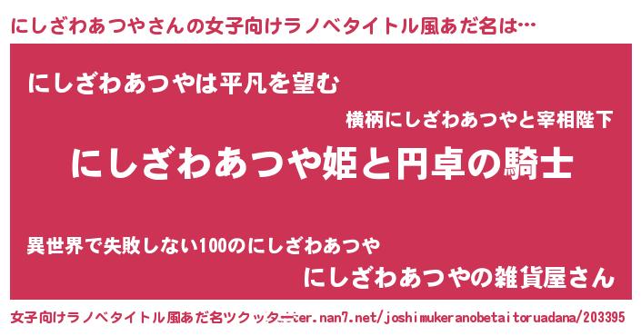 | 男性向けラノベタイトル風あだ名 | 『ニシザワアツヤアートオンライン』 |