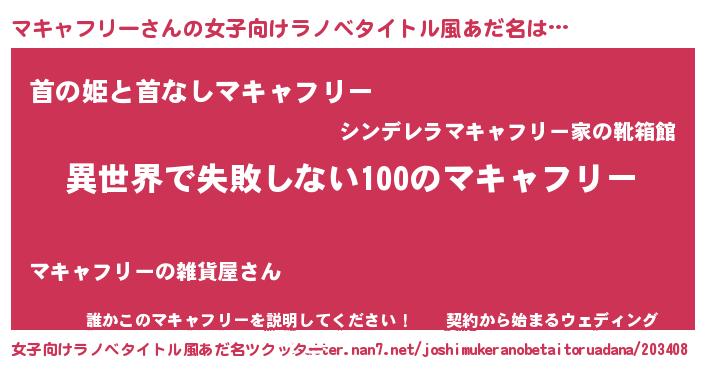 マキャフリーさんの女子向けラノベタイトル風あだ名は… 『異世界で失敗しない100のマキャフリー』『首の姫と首なしマキャフリー』『誰かこのマキャフリーを説明してください! ~契約から始まるウェディング~』 ツクッター #女子向けラノベタイトル風あだ名ツクッター http://tkutter.nan7.net/joshimukeranobetaitoruadana/203408/