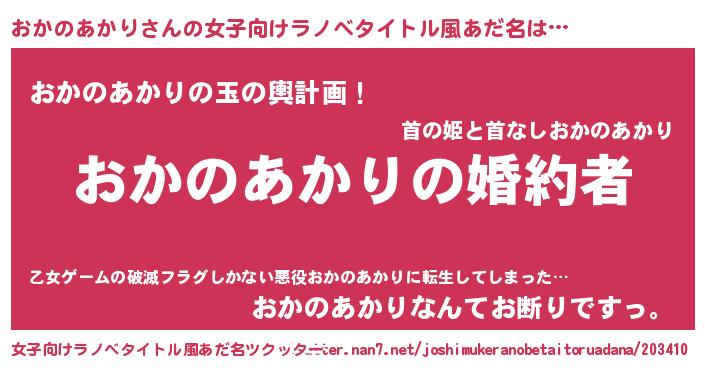 | 男性向けラノベタイトル風あだ名 | 『うちの娘の為ならば、俺はもしかしたらおかのあかりも倒せるかもしれない。』 |