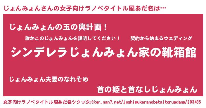 | 男性向けラノベタイトル風あだ名 | 『冴えないじょんみょんの育てかた』 |