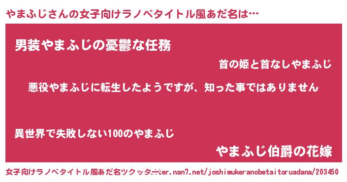 | 男性向けラノベタイトル風あだ名 | 『この素晴らしい世界にやまふじを!』 |