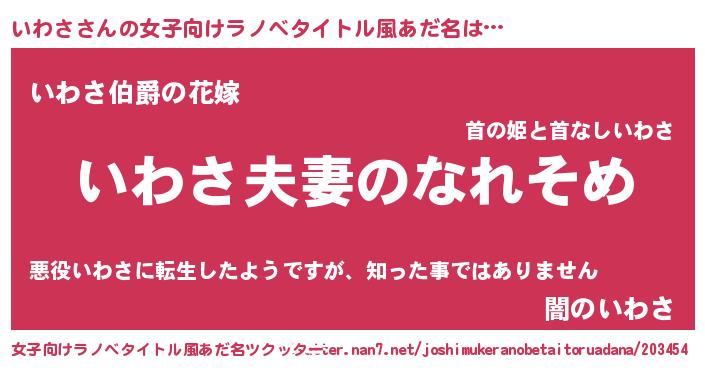 | 男性向けラノベタイトル風あだ名 | 『おまえをオタクにしてやるから、俺をいわさにしてくれ! 』 |