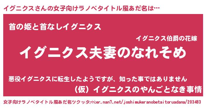 | 男性向けラノベタイトル風あだ名 | 『おまえをオタクにしてやるから、俺をイグニクスにしてくれ! 』 |