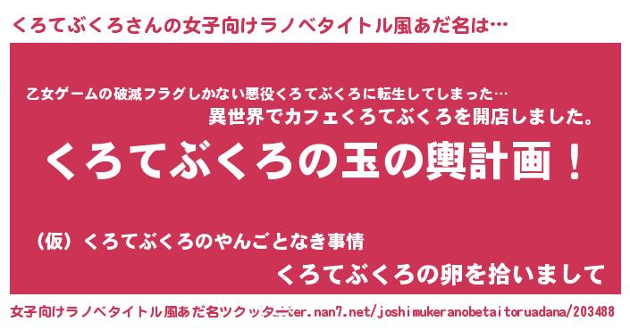 | 男性向けラノベタイトル風あだ名 | 『くろてぶくろ~年齢イコール彼女いない歴の魔法使い~』 |