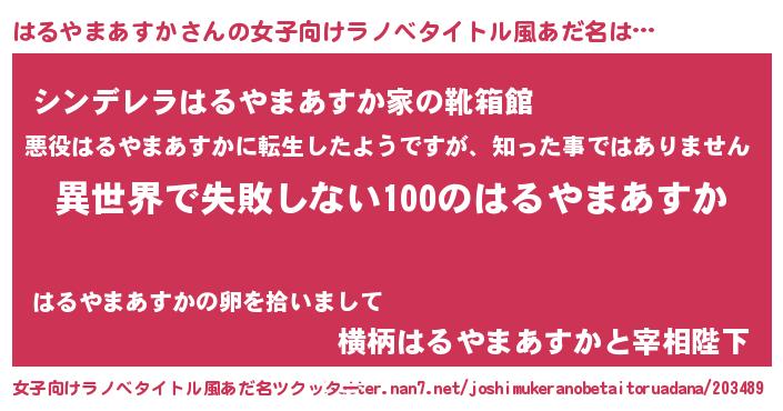 | 男性向けラノベタイトル風あだ名 | 『はるやまあすかという概念が存在しない退屈な世界 』 |