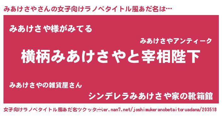 | 胡散臭い通販商品みたいなあだ名 | 『全米が絶賛したサプリメント…その名も「みあけさや」』 |