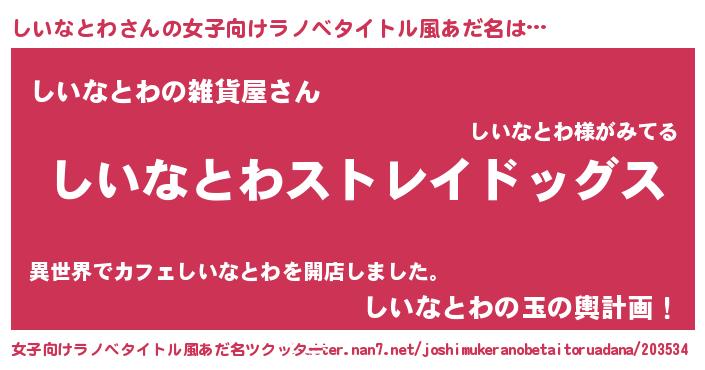 | 男性向けラノベタイトル風あだ名 | 『Re:しいなとわから始める異世界生活』 |