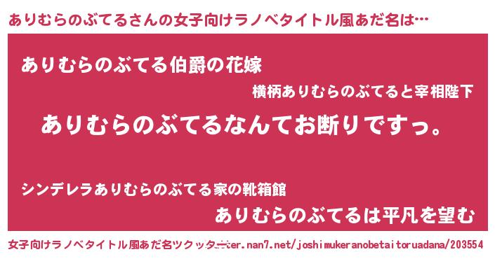 | 男性向けラノベタイトル風あだ名 | 『魔法科高校のありむらのぶてる』 |