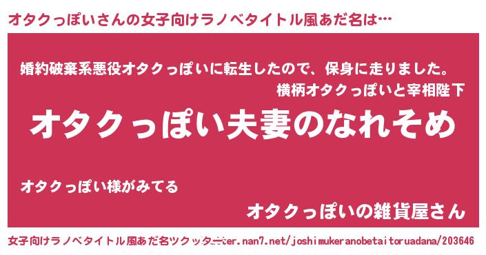 | 男性向けラノベタイトル風あだ名 | 『おまえをオタクにしてやるから、俺をオタクっぽいにしてくれ! 』 |