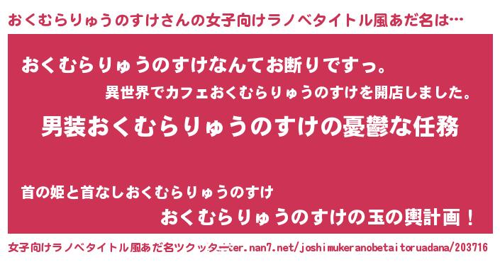 | 男性向けラノベタイトル風あだ名 | 『冴えないおくむらりゅうのすけの育てかた』 |