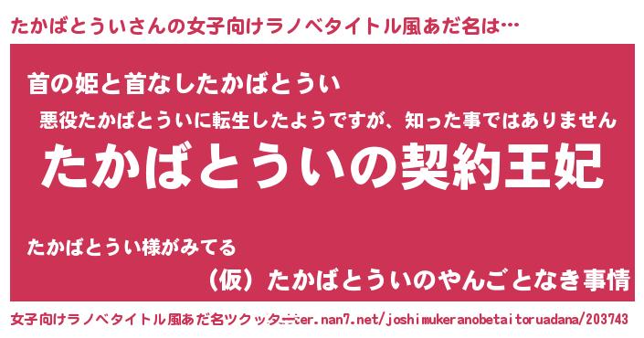| 男性向けラノベタイトル風あだ名 | 『たかばとういという概念が存在しない退屈な世界 』 |