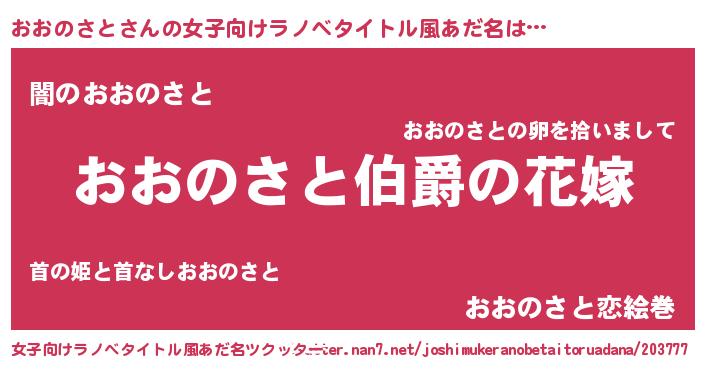 | 男性向けラノベタイトル風あだ名 | 『うちの娘の為ならば、俺はもしかしたらおおのさとも倒せるかもしれない。』 |