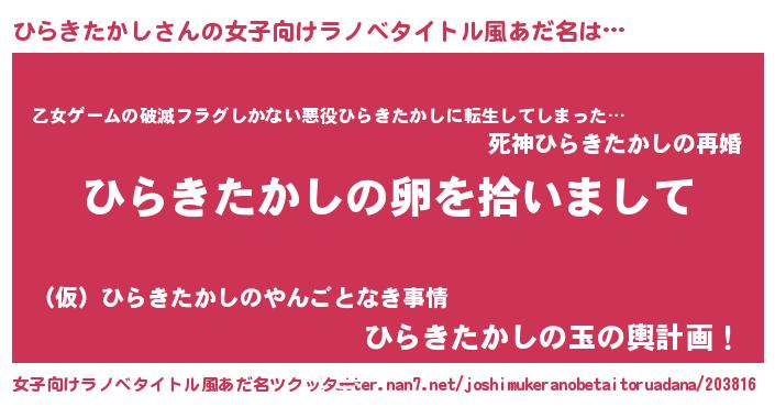 | 男性向けラノベタイトル風あだ名 | 『ひらきたかしの嫁は女の子じゃないと思った?』 |